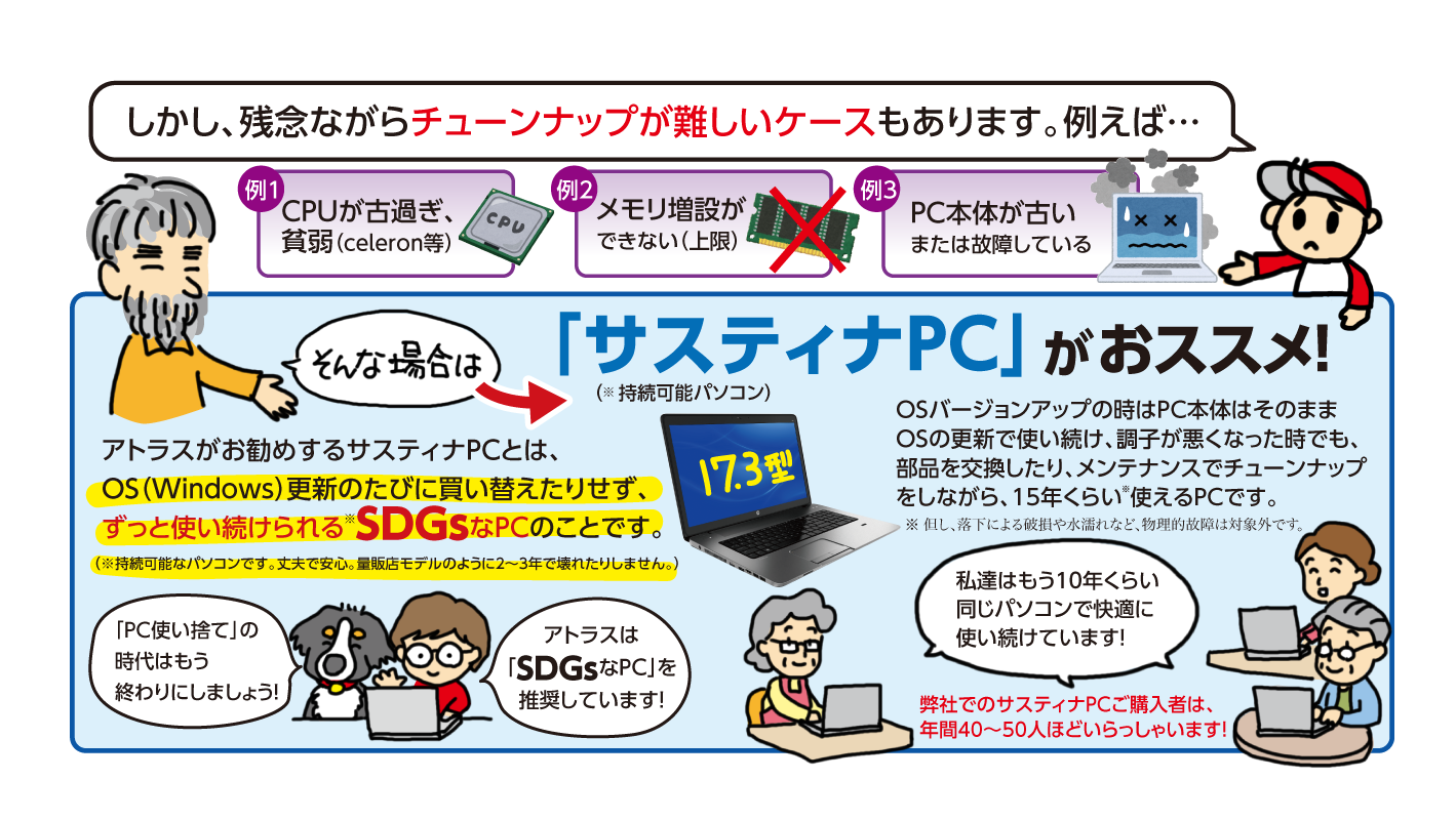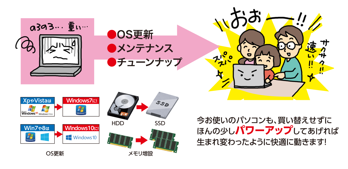 パソコンは2〜3年で買い換える消耗品とお考えではありませんか?今お使いのパソコンもほんの少しパワーアップしてあげれば、生まれ変わったように快適に動きます。「PC使い捨て」の時代はもう終わりにしましょう!